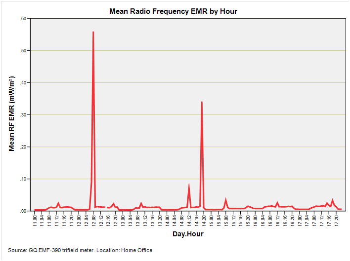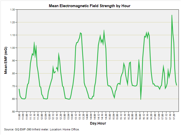 I have no idea what was happening at 6pm on Tuesday 17th but we’d obviously turned something electro-noisy on! More detective work of this nature is to follow as will an assessment of the overall level of EMF across the week, whose mean fetches up at 0.78mG. When I can find the time I’ll go sit in a remote field and see what nature-boy figures I get.
