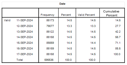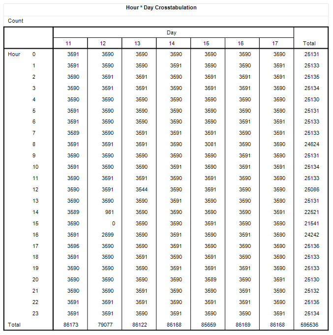 If I cross-tabulate day of month by hour of day then we see a consistent pattern of ~3,590 records per cell instead of 3,600 which suggests around 10 records are lost pretty much every hour for some unknown reason. You can see my blooper sticking out like a sore thumb at between 2pm and 4pm on Thursday 12th.