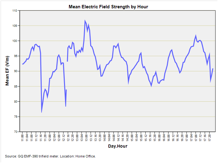 No obvious regular daily pattern is seen with electric field strength but I’m sure there is something here to squeeze out in the next article. Our absence on Sunday 15th is also less dramatic. What fascinates are those two sharp dips at 5pm on Wednesday 11th and 2pm on Thursday 12th – I shall be delving further! The series mean fetches up at 93.3V/m, which seems rather a lot so I may need to reconsider the siting of the device. Then again I ought to check values at various points around the house and garden as well as that remote field.